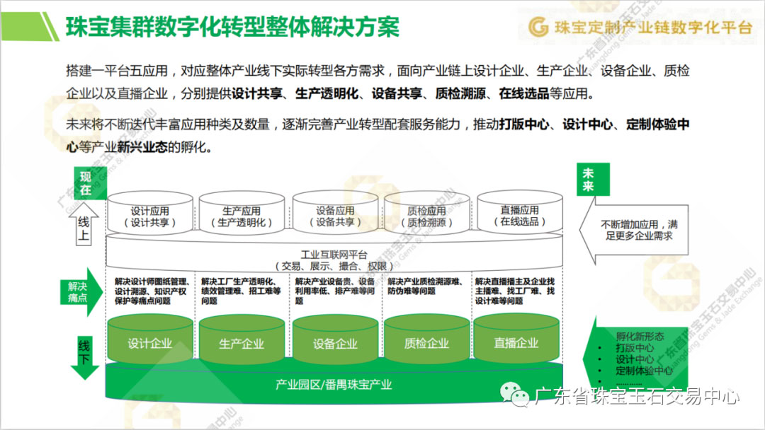 珠宝产业集群数字化转型项目由广州市工业和信息化局指导,广东省珠宝玉石交易中心牵头、联合行业企业共建,打造联通珠宝原料采购、珠宝设计、加工、质检、销售等珠宝全产业链以及人才、定制体验、直播等全业态的珠宝产业专项服务体系,通过提供共享设计应用、生产透明化应用、设备共享应用、质检应用、直播应用五大应用以及承载五大应用的工业互联网平台,构建完整产业数字化转型服务链条体系。