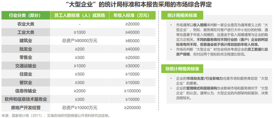 从市场和商务视角上看,报告所指的“大型企业”还包括上述指标不显著低于统计局标准,且在管理模式、数字化需求、采购流程等方面具备下图及报告第三章所示特征的企业。