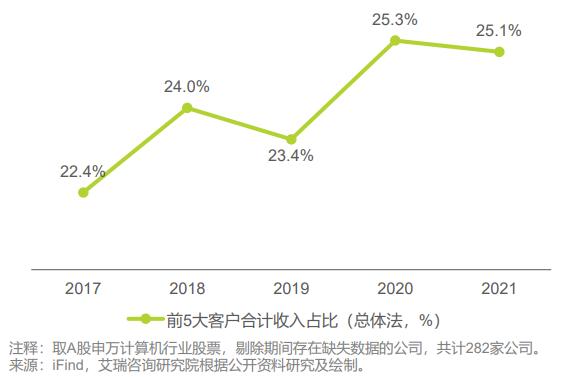 从服务商视角上看,“大客户”对于计算机企业收入的贡献比例较高,2021年前5大客户整体贡献收入比例超过25%,且近年来呈现上升趋势,这也意味着来自大客户的收入增速超过企业收入的整体增速,这反应了服务大客户对计算机行业企业经营和增长的意义。