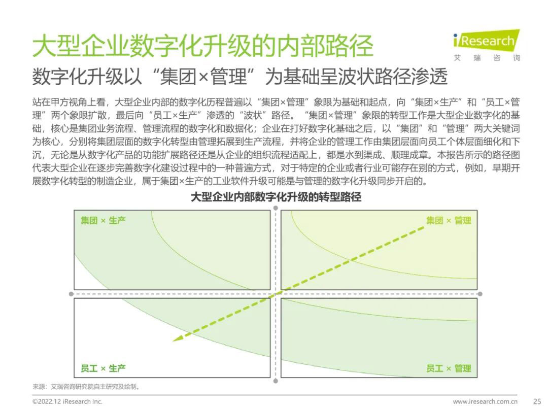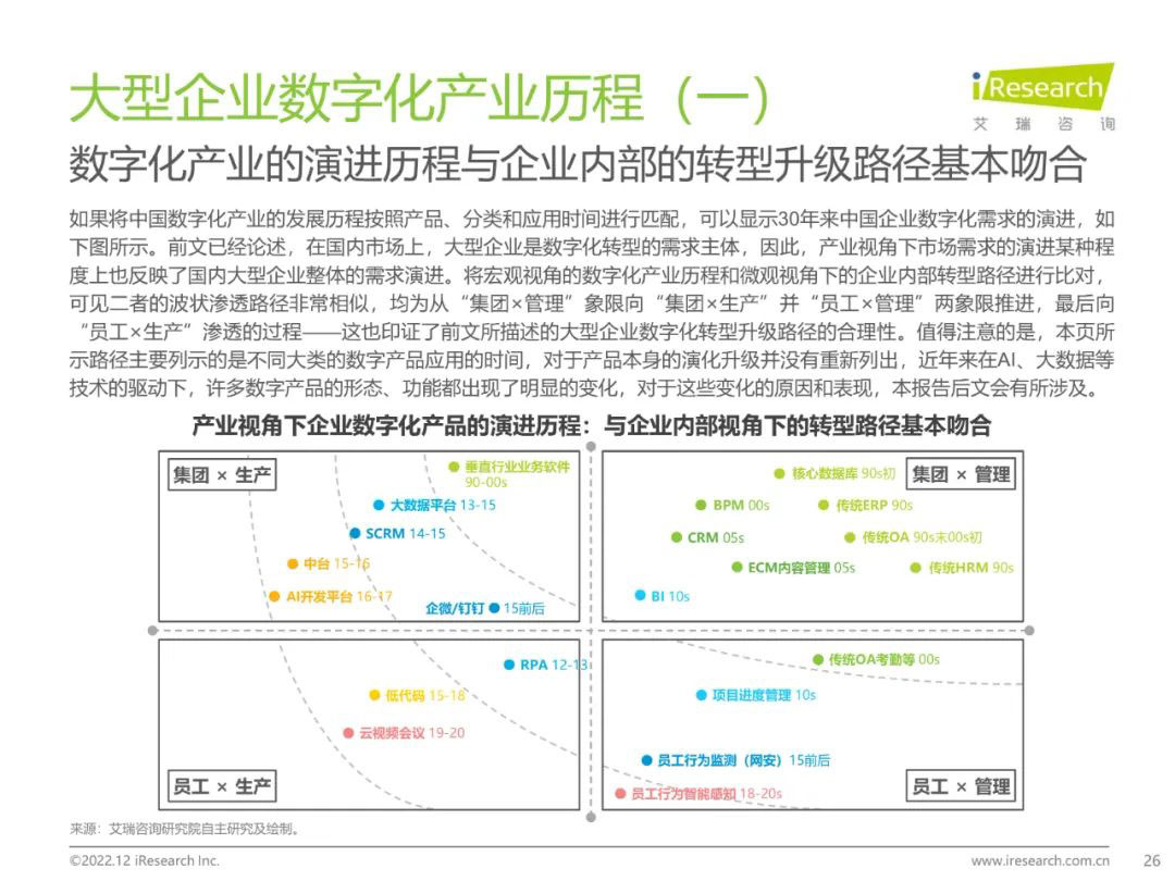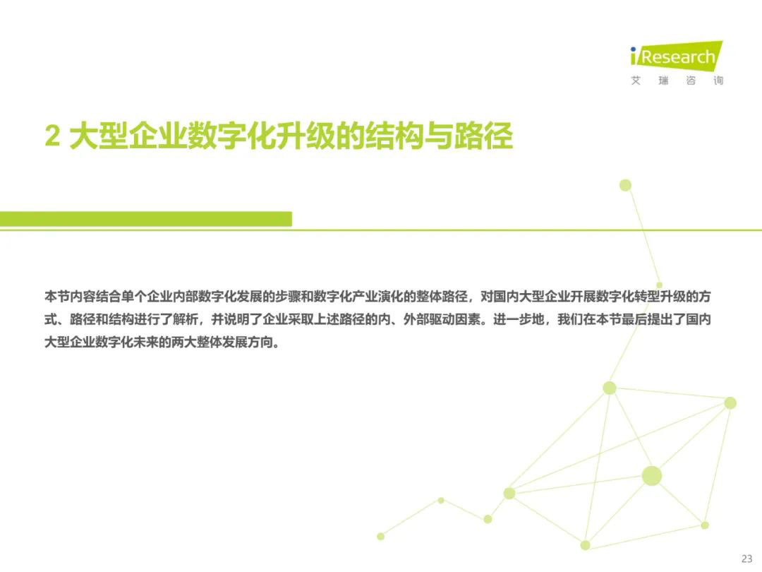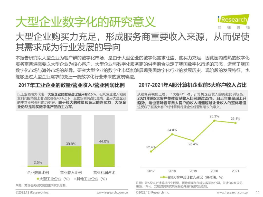 本报告研究以大型企业为客户群的数字化市场,是由于大型企业的数字化需求旺盛、购买力充足,因此国内成熟的数字化服务商普遍需要以大型企业为核心客户。大型企业与数字化服务商的供需磨合决定了我国数字化市场的形态,造就了我国数字化市场与海外市场的差异。研究大型企业的数字化市场能够展现我国数字化行业的发展历史、现阶段的发展特征,也能够通过大型企业需求的变迁一窥数字化行业未来的发展轨迹。