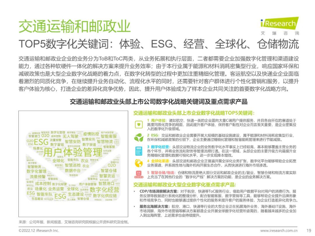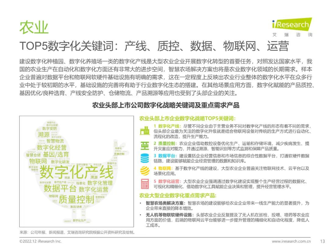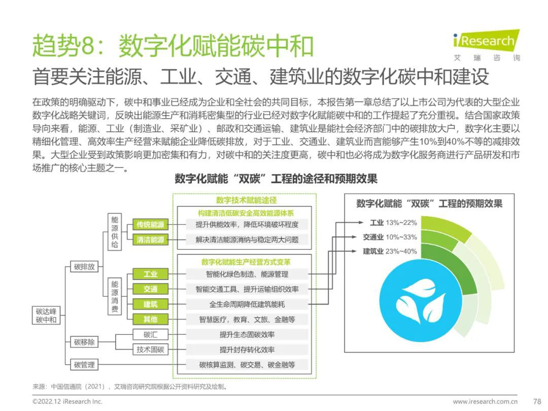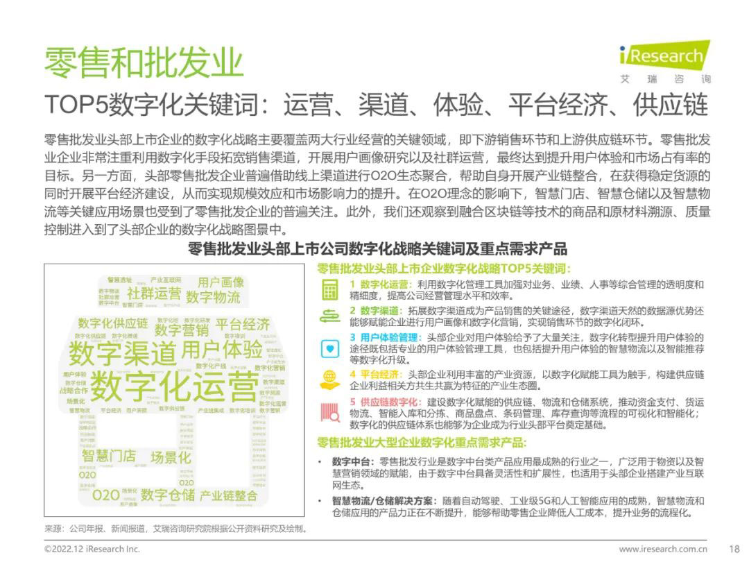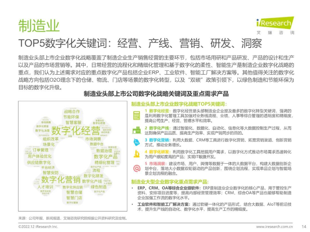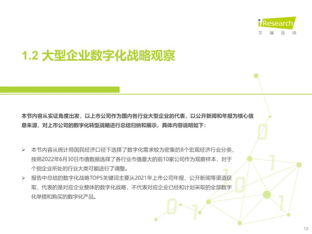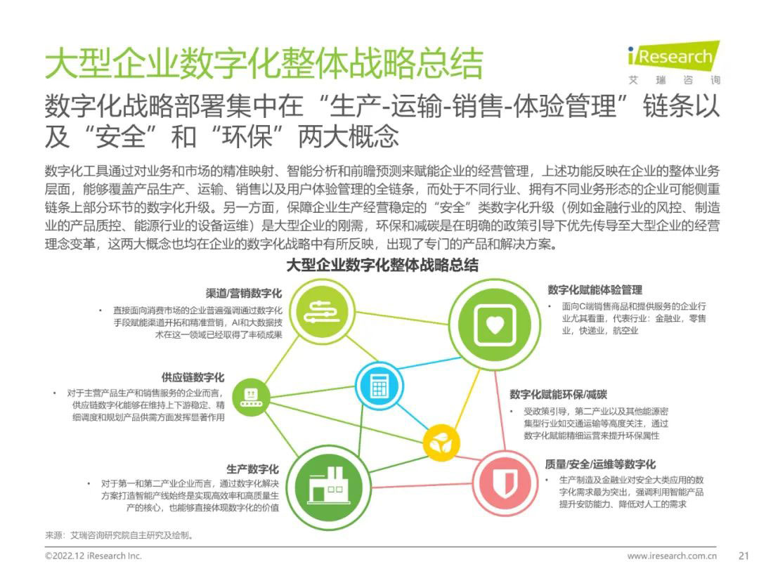 2021年中国大型企业数字化支出规模约为2.8万亿元,估算2021-2026年中国大型企业数字化支出平均复合增速将达到12.3%。基于对上市公司数字化战略的分析,艾瑞咨询发现大型企业数字化战略部署集中在“生产-运输-销售-体验管理”链条以及“安全”和“环保”两大概念。