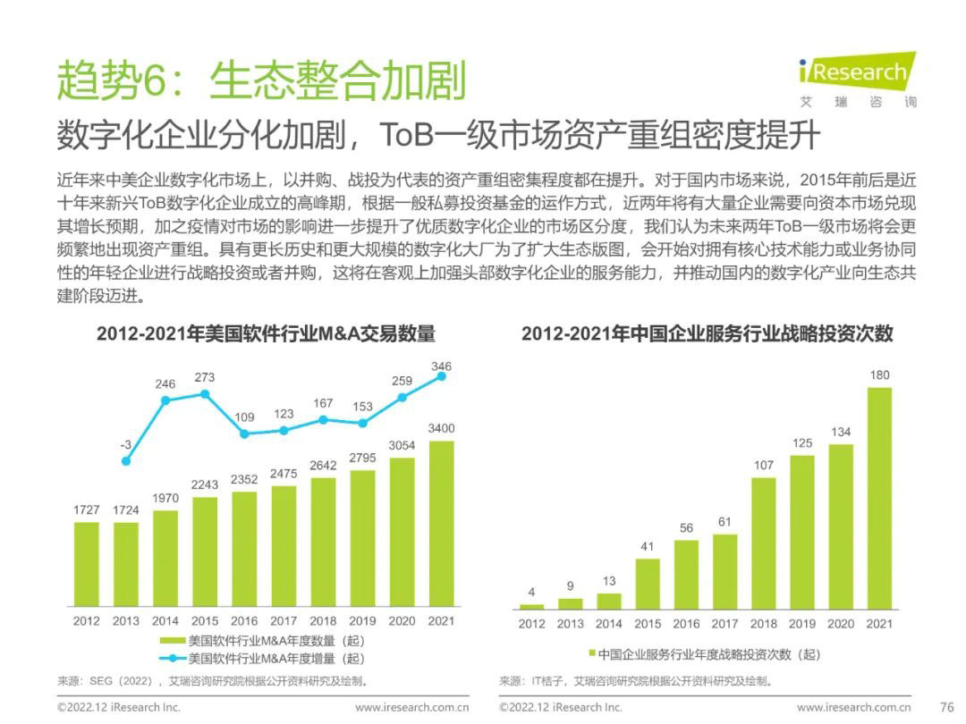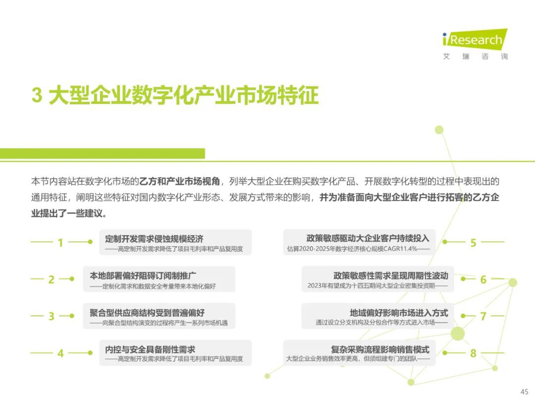 由于大型企业的数字化需求旺盛、购买力充足,因此国内成熟的数字化服务商普遍以大型企业为核心客户。大型企业与数字化服务商的供需磨合决定了我国数字化市场的形态,造就了我国数字化市场与海外市场的差异。