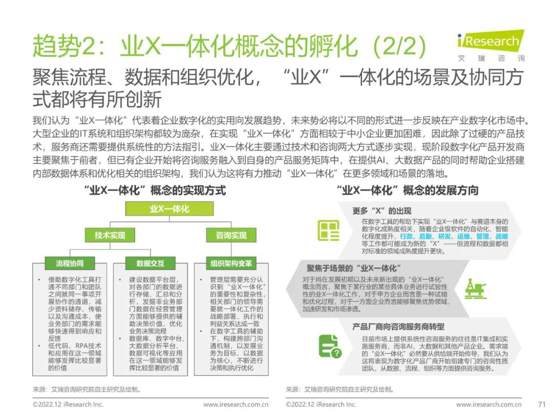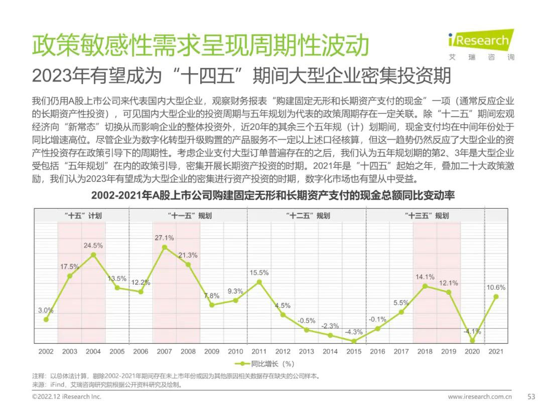 经艾瑞咨询核算,2021年中国大型企业数字化支出规模约为2.8万亿元,估算2021-2026年中国大型企业数字化支出平均复合增速将达到12.3%。受疫情和宏观经济增长状况影响,2020和2022年大型企业数字化支出增速有所波动,预计2023年市场景气度将有所恢复。整体来看,由于大型企业数字化转型需求具备相对刚性,且大型企业自身扛风险能力较强,市场增速整体平稳。